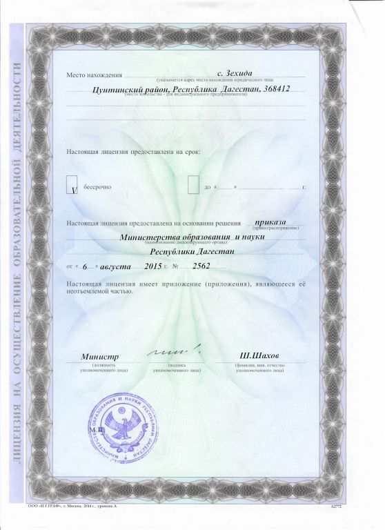 | Адрес местонахождения образовательной организации* | 368412 РД Цунтинский р-он с. Зехида ул. Курамагомеда хаджи №20 |